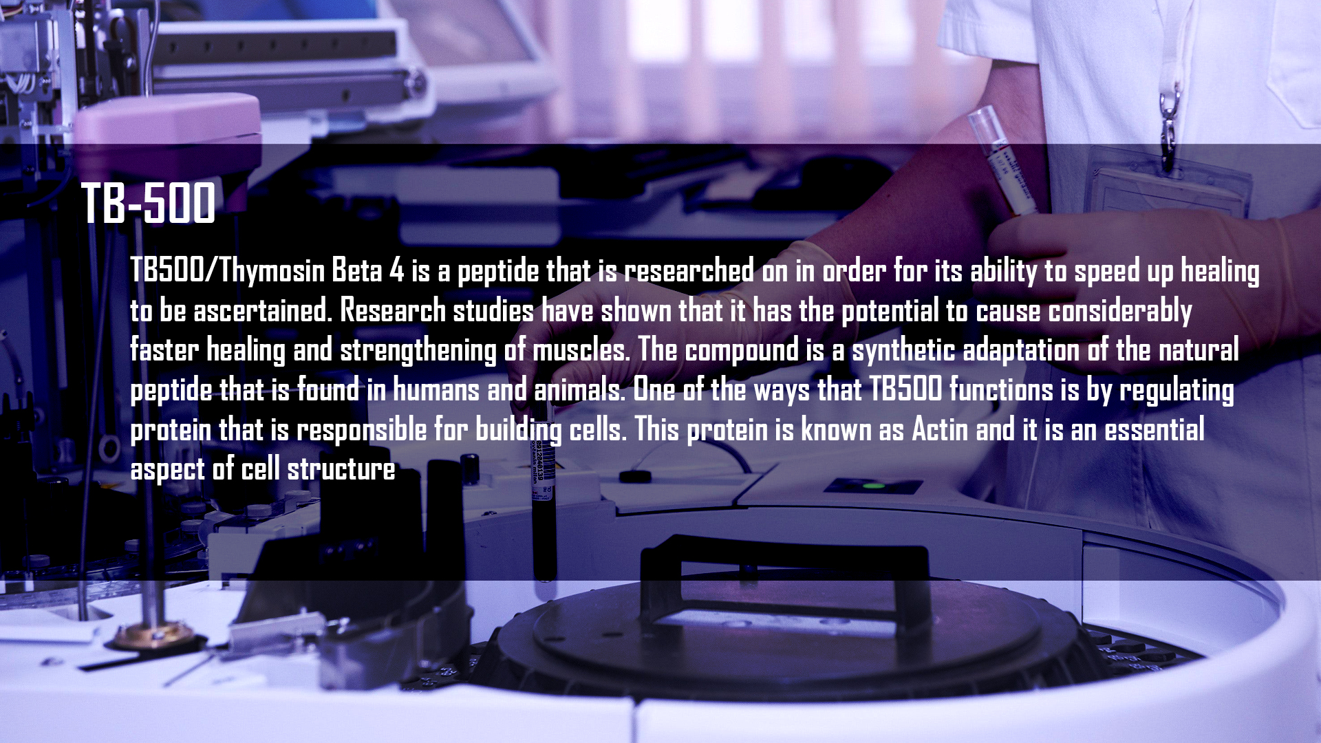 Thymosin-β4 is a major cellular constituent in many tissues. Its intracellular concentration may reach as high as 0.5 mM.Following Thymosin α1, β4 was the second of the biologically active peptides from Thymosin Fraction 5 to be completely sequenced and synthesized.